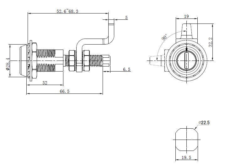 美科机箱机柜锁MK413,锌合金材质,带折弯舌片,一字型钥匙,支持定制,常做为配电箱锁,电表箱锁等。
