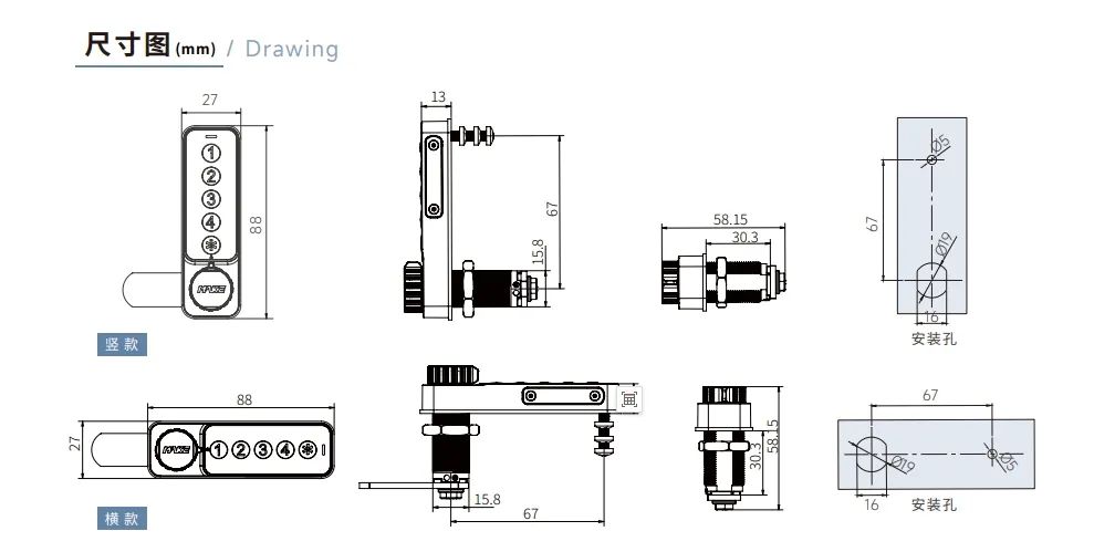 如果你想在柜子上直接用它替换旧锁,只要是标准16*19mm安装孔,MK-E750可直接1:1换锁,不伤柜门。