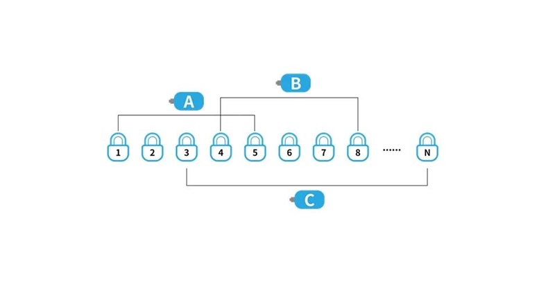 2.可开N把锁可授权开一把或N把锁具,便于零售店交叉管理。例如A钥匙授权开1~5号锁;B钥匙授权开4~8号锁;C钥匙授权开3~N号锁。每一位店员用一把钥匙即可管理多台展示设备。
