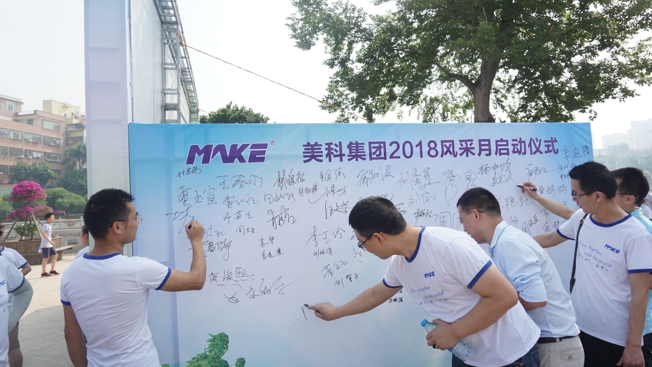景好人美朝阳斜,工作人员一大早就前来搭建舞台,准备矿泉水和环保工具,一切准备就绪后,所有美科人纷纷在启动仪式板报上签名留影,开跑前,人力资源部卢经理宣读了本次活动主题是“扬工匠精神,展美科风采”,并对相关规则进行了说明。
