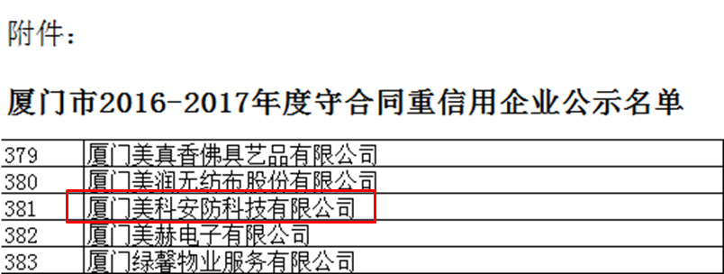 经过厦门市市场监督管理局层层严格审查,贝博艾弗森官网:贝博艾弗森官网科技有限公司榜上题名,荣获2016-2017年度厦门市守合同重信用企业。有效期内,可享受省工商局、税务局、发改委等政府部门的数十项帮扶优惠政策。此次获选,是政府部门对美科诚信经营的高度认可,同时也说明了美科锁具拥有良好的市场口碑。