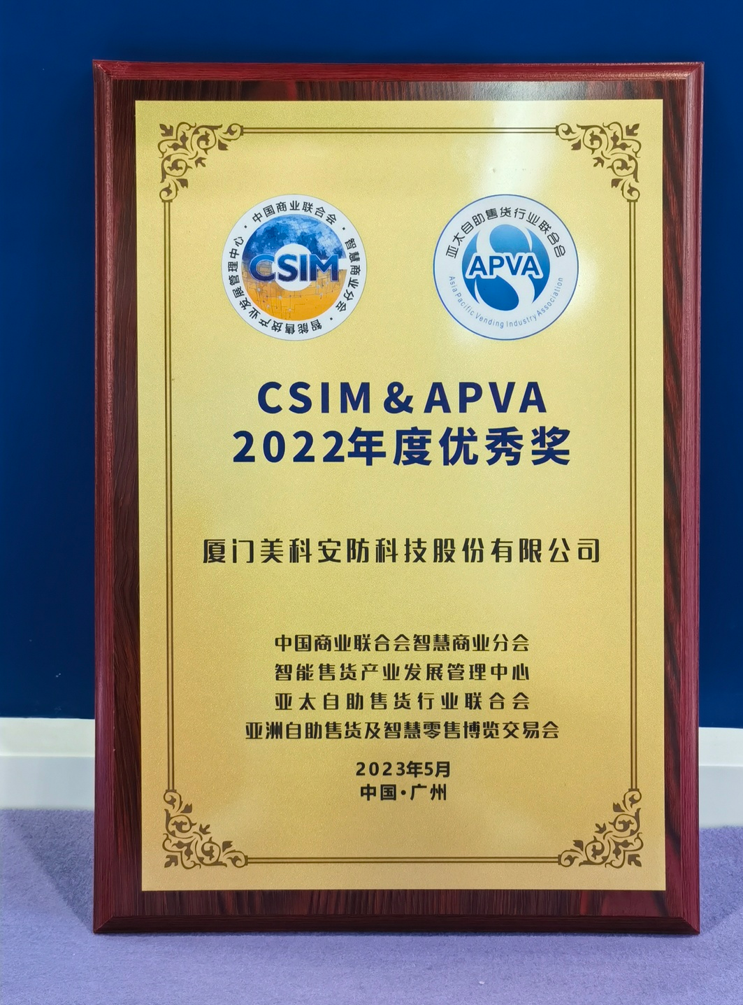 展会上,美科凭借优质的产品和研发创新能力,荣获中国商业联合会与亚太自助售货行业联合会(简称:CSIM&APVA) 2022年度优秀奖。