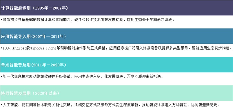 根据应用服务智能化水平等要素,智能终端行业演进历程可概括为以下四个关键阶段:计算机智能起步期、应用智能导入期、单点智能普及期、协同智慧发展期。