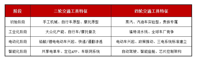 交通工具行业的发展历程,可分为二轮(自行车、电动车、摩托车)与四轮(汽车、卡车、公交、特种车)两个大类,它们各自经历了从机械驱动到电动化、智能化的深刻演变。
