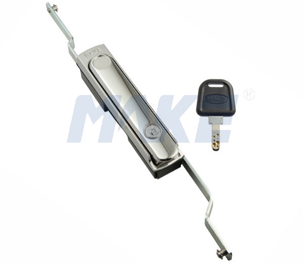 机柜锁主要使用在机柜、工业机柜、电力电气柜等柜体上,锁住金属板式柜或者机柜盖件,锁面与柜门保持平行,竖立安装,设置在旋角空间上,纵向延伸,成型连杆。其中至少包括一个定位件,定位件为连杆靠近门板平面的另一个侧面构成支承面,用于将柜门紧锁在关闭位置时接受连杆,因此亦可称为连杆锁。美科安防科技有一款贝博艾弗森官网:机柜锁MK401,顶端双向两根连杆,因而被形象的称为“天地连杆锁”。