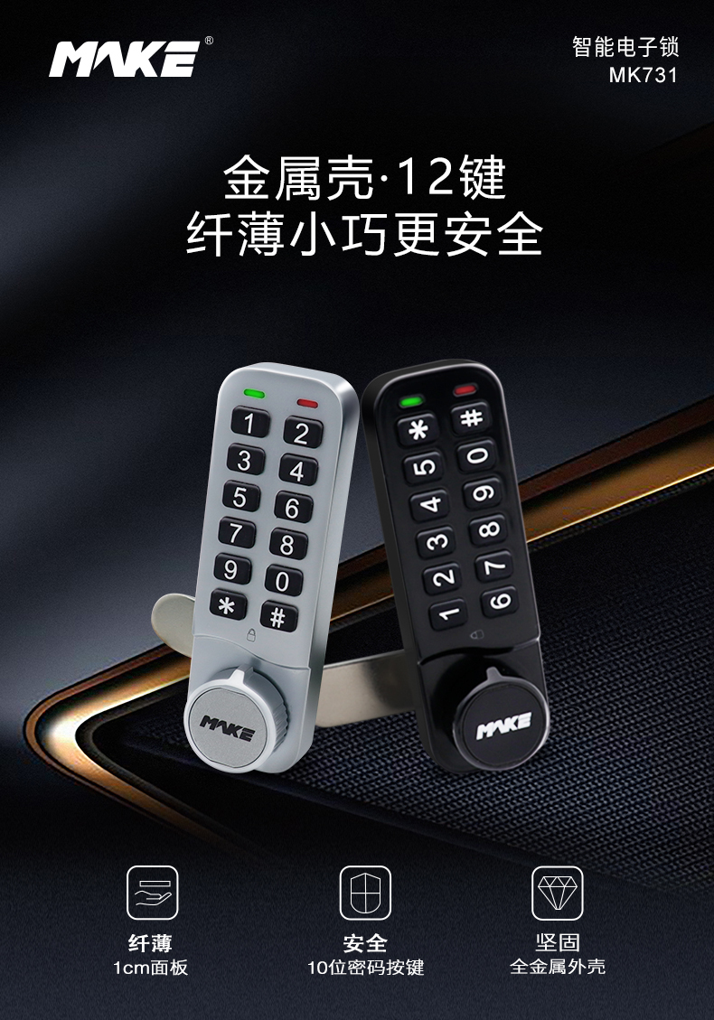 MK731-2采用锌合金材质制作,1cm纤薄面板,可完美贴合各种柜面;锁舌作用长可以调节,可以匹配多种使用场合,功耗相对更低。全硅胶按键,具有优良的耐热性、耐寒性特点,使用时手感颇为舒适;密码由用户设定及更改,使用时无需唤醒,输入密码即可开锁,操作简便;IP54防尘防水等级,尤其适用于健身房、游泳馆、洗浴中心等潮湿环境。
