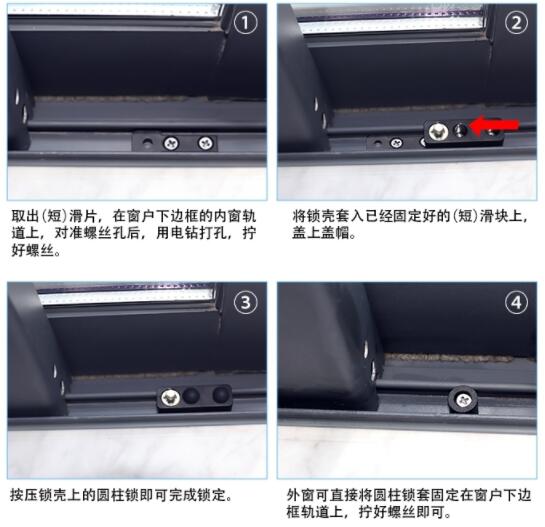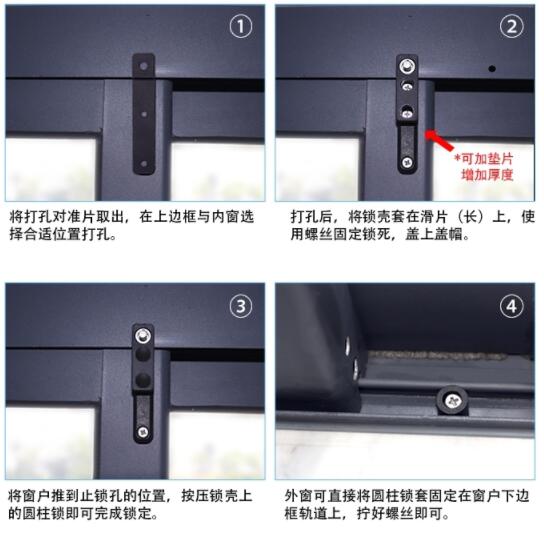 在窗户上边框与内窗选择合适的位置打孔,将窗户推到止锁孔的位置,按压锁壳上的圆柱锁即可完成锁定。这种安装方式不仅方便,而且由于位置较高,能够防止儿童破坏。