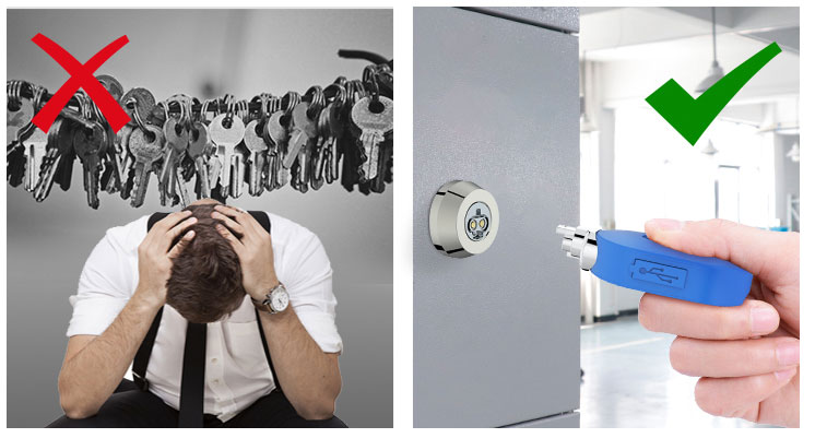 l电子钥匙采用流程化授权管理,严格控制电子锁的操作权限和操作时间,即使钥匙丢失只需进行挂失不需更换锁芯;钥匙可以对临时工作人员进行授权授权管理,解决了临时工作的管理和追责问题。