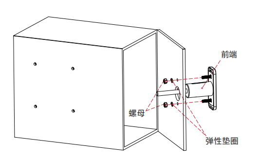在尾端固定后,将锁具前端插入门板事先打好的孔中,装上弹性垫圈,最后顺时针旋紧螺母将前端固定。