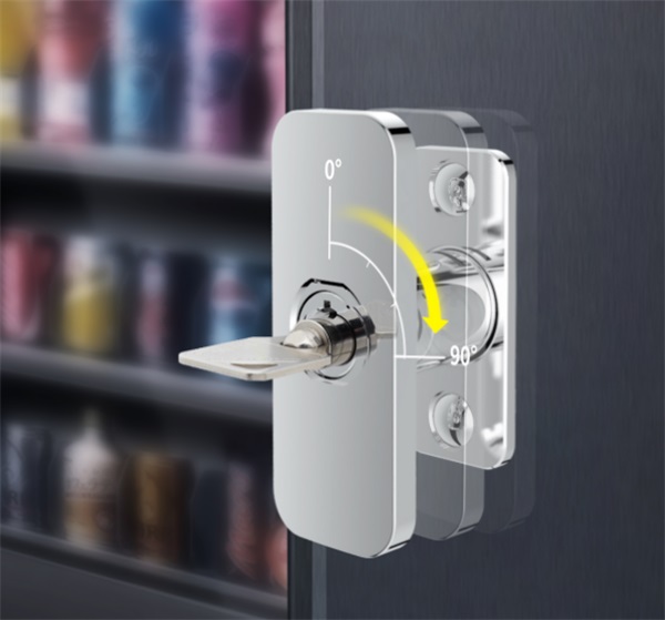 此外,美科两款智能自助售货机锁还备有机械应急解锁功能。遇到特殊情况时,工作人员可取下防尘盖,插入应急钥匙,顺时针旋转90°即可解锁。