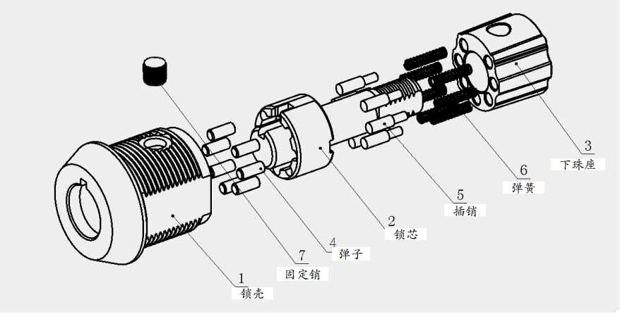 管状锁是采用圆柱形销栓的弹子锁。主要分为7个零件,分别为锁壳、锁芯、下珠座、弹子、插销、弹簧、固定销。各个零件之间的相互配合,达成上锁开锁目的。
