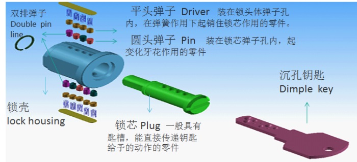 双面弹子锁采用沉孔钥匙系统。锁芯一般设计有多个弹子孔且与锁壳的弹子孔相对应,锁芯的弹子插入锁壳中或锁壳中的空心弹子插入锁芯中,使锁芯不能任意旋转。