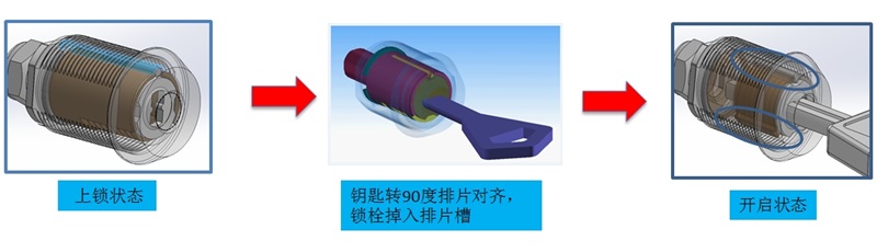 其开锁原理是,上锁状态下,通过排片顶出锁栓到锁壳槽内,锁栓卡住转套不能转动,钥匙旋转90度,排片对齐,锁栓掉入排片槽,钥匙再转动90度开锁。